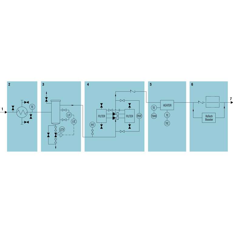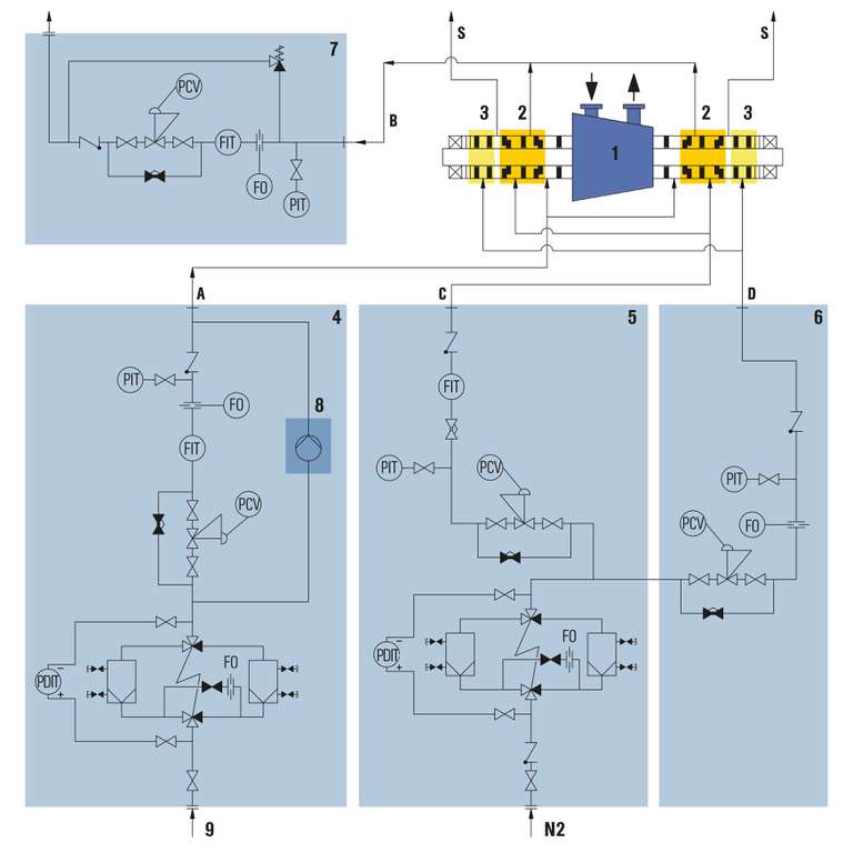 Gas supply systems of the GSS range are specially designed for contact-free operated, gas-lubricated mechanical seals. The gas supplied from the supply network (e.g. air or nitrogen) is regulated/monitored by the GSS in accordance with the requirements of the seals being supplied. The GSS systems are equipped with alarm and/or switch-off points depending on specific safety requirements. Centralized monitoring of the measurement values is also possible on request.